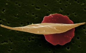 這張電子掃描顯微照片也是由安妮-韋斯頓(Anne Weston)拍攝的,它顯示從肺癌細胞培基上長出的單細胞,其中不對稱紫色突起叫做大皰,它與癌細胞產(chǎn)生質(zhì)膜的細胞骨架出現(xiàn)局部分離。起泡對于包括細胞移動、細胞分裂、物理和化學(xué)應(yīng)力的多樣性細胞變化進程非常重要。