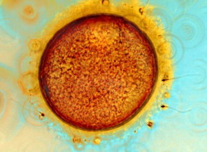 這張顯微照片清晰地捕捉到人工試管受精(IVF)過程。圖中的卵細胞(棕色球體)要比精子細胞大許多,其周圍圍繞著保護積云細胞(圖中黃色部分),卵細胞周圍的薄膜是卵膜,精子頭部攜帶著酶試圖溶解卵膜,從而與卵細胞結(jié)合。
