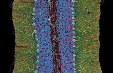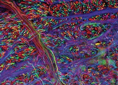 用暗視場顯微鏡觀察的復(fù)雜的大腦 復(fù)雜的大腦:美國加利福尼亞大學(xué)圣迭戈分校的托馬斯•迪林克(Thomas Deerinck)利用雙光子顯微技術(shù)(2-photon microscopy),拍攝到了一塊僅有400μm厚的小鼠小腦組織樣本的精細(xì)顯微結(jié)構(gòu)(見上圖),其中綠色的是浦肯野神經(jīng)細(xì)胞(Purkinje neuron),紅色的是神經(jīng)膠質(zhì)細(xì)胞(glial cell),藍(lán)色的則是神經(jīng)核。