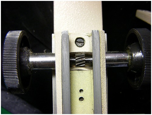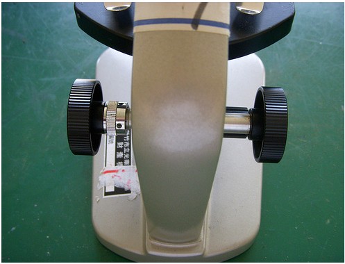 粗調(diào)節(jié)輪是怎麼「粗」調(diào)的呢?無(wú)論是顯微鏡調(diào)鏡筒還是載物臺(tái)的高度,原理都一樣,都是利用齒輪。在圖中,把鏡筒升高之后,后面就可以看到一齒一齒的東西,有時(shí)候顯微鏡會(huì)發(fā)生粗調(diào)節(jié)輪調(diào)到正確高度,卻又慢慢滑下來(lái),原因就發(fā)生在那一齒齒的上面。