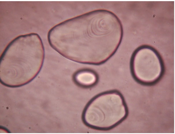 再放大一點(diǎn),可以看見(jiàn)淀粉粒上的環(huán)紋,中心點(diǎn)就是臍的位置。
