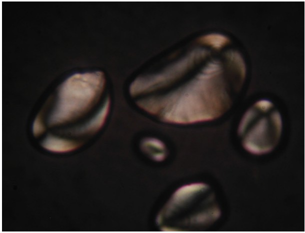 不過(guò)只要旋轉(zhuǎn)偏光片,嘿嘿!世界就不一樣了,淀粉粒上會(huì)出現(xiàn)十字,這個(gè)十字有特殊的名字,稱為馬爾他十字(Maltese Cross),十字的交點(diǎn)就在淀粉粒的臍。
