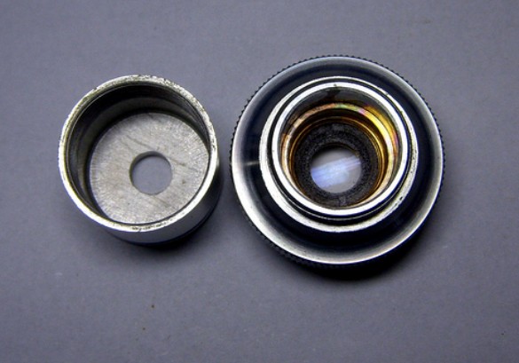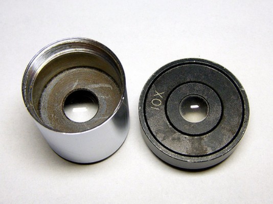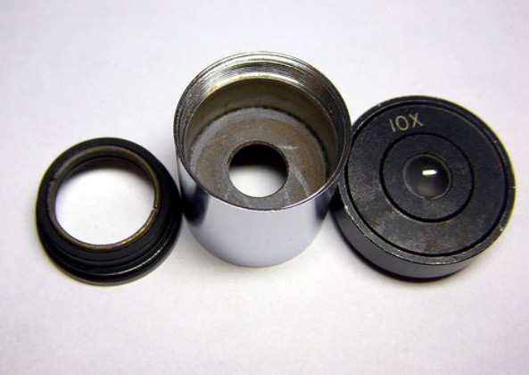 10X的物鏡稍微複雜一點(diǎn)。順帶一提,顯微鏡10X物鏡拆到較后,得到的中間那玩意超棒!可以當(dāng)作高倍的放大鏡來(lái)用。只用這個(gè)東西,我甚至可以直接靠在吊竹草的葉背,看見氣孔的分佈,或是靠在蕨葉背,看見孢子囊的環(huán)紋。