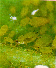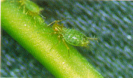 外形特征:無翅胎生成蟲體黃綠色,尾片下半部有側(cè)毛12、13根。腹管較尾片長,觸角6節(jié)。尾片褐色。